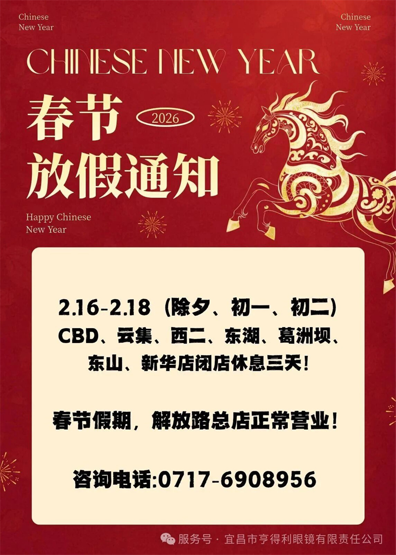 馬年將至,恭祝大家馬年大吉大利! 春節(jié)期間,宜昌亨得利眼鏡放假安排如下: 2.16-2.18 (除夕、初一、初二)CBD、云集、西二、東湖、葛洲壩、東山、新華店閉店休息三天! 春節(jié)假期,解放路總店正常營業(yè)! 咨詢電話:0717-6908956